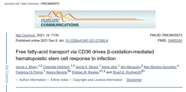 近日,發表在《Nature Communications》上的一篇標題為:“Free fatty-acid transport via CD36 drives β oxidation-mediated hematopoietic stem cell response to infection"的文章,揭示了脂肪的另一個作用。